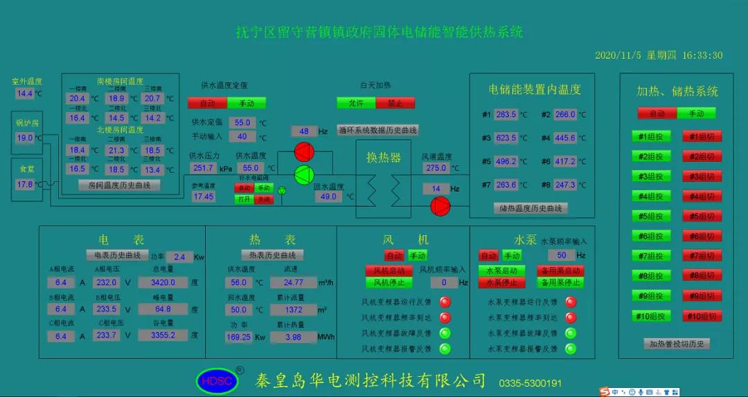 2020年11月5日,秦皇島華電測控科技有限公司保質(zhì)保量地完成了秦皇島市某鎮(zhèn)政府供熱系統(tǒng)改造工作,并于11月5日開啟了供暖工作。本次改造工作,將原有的燃油鍋爐改造成智能電儲能供熱系統(tǒng),實現(xiàn)環(huán)保取暖與智能控制等多重效果。
