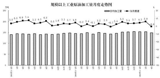 原油加工量下降。4月份,原油加工量4445.2萬噸,同比下降0.6%;日均加工量148.2萬噸,比3月份下降3.3%,這主要是受部分大型石化企業(yè)停產檢修影響。主要成品油生產也有所回落,其中,汽油產量同比下降4.0%,煤油產量增長2.2%,柴油產量下降0.6%。1-4月份,原油加工量18251.0萬噸,同比增長3.1%,比1-3月份回落1.4個百分點。