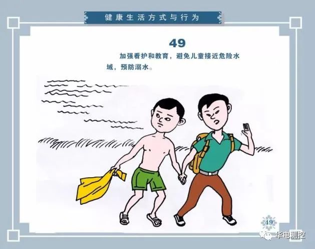 提高健康素養(yǎng),應(yīng)當(dāng)從兒童抓起。重點要加強學(xué)校、家庭和社會對兒童生命教育的同時,教育家長要加強對孩子看護,預(yù)防兒童溺水?!吨袊窠】邓仞B(yǎng)—基本知識與技能》第二部分,關(guān)于“健康生活方式與行為”,其中第四十九條明確強調(diào):“加強看護和教育,避免兒童接近危險水域,預(yù)防溺水。”
