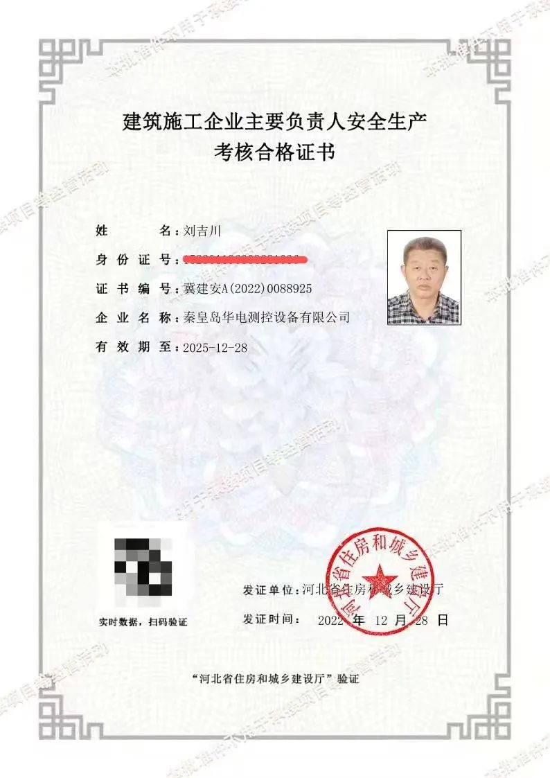 祝賀秦皇島華電測控設(shè)備有限公司獲批建筑施工安全生產(chǎn)許可證書