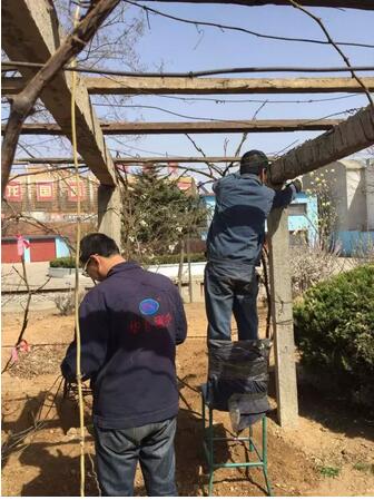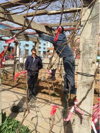 正值春暖花開、草長鶯飛之際,公司花園一派生機勃勃的景象,在公司黨支部書記兼副總經(jīng)理劉劍鋒的帶領(lǐng)下,張勇清、尹新磊、劉冬建、任有志、張靜于周六下午來到公司進行葡萄架的搭建和培植,并翻土疏松,為樹木植被澆水。