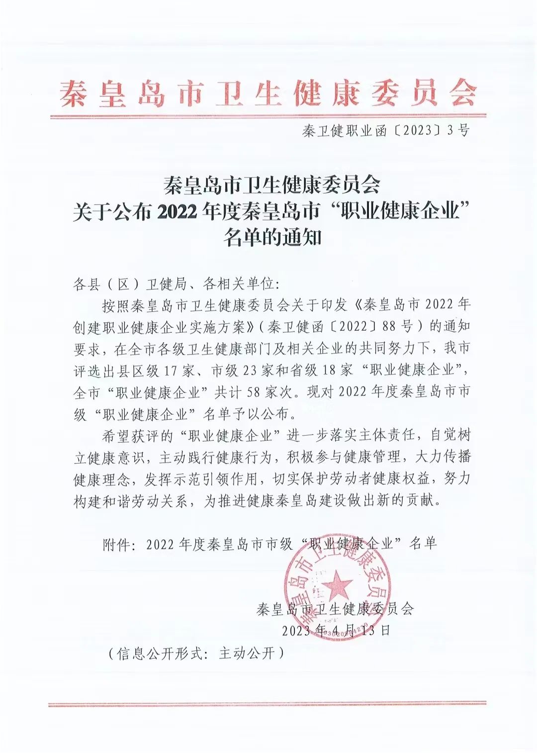 2023年4月21日,我公司獲悉來自秦皇島市衛(wèi)生健康委和秦皇島市海港區(qū)衛(wèi)生健康局的文件通知,秦皇島華電測控設(shè)備有限公司獲評為2022年度市級“職業(yè)健康企業(yè)”。為更好More