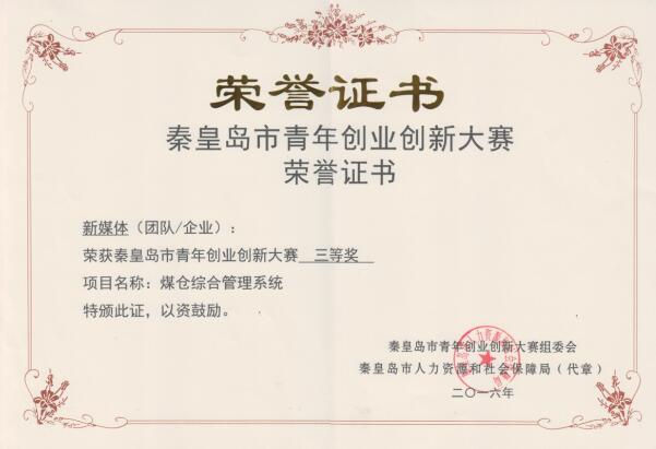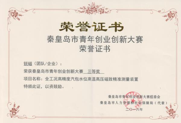 2016年5月,公司組建了“銳磁”和“新媒體”兩個團隊,參加秦皇島市青年創(chuàng)業(yè)創(chuàng)新大賽,其中“銳磁”團隊的參賽項目為《全工況高精度汽包水位高溫高壓磁致精準(zhǔn)測量裝置》,“新媒體”團隊的參賽項目為《煤倉綜合管理系統(tǒng)》,經(jīng)過兩個團隊的不斷開拓創(chuàng)新,兩個項目先后在市級、省級及國家級的比賽中連獲殊榮?!度r高精度汽包水位高溫高壓磁致精準(zhǔn)測量裝置》獲得秦皇島市青年創(chuàng)業(yè)創(chuàng)新大賽三等獎,第二屆“中國創(chuàng)翼”青年創(chuàng)業(yè)創(chuàng)新大賽高端設(shè)備制造類項“金翼獎”;《煤倉綜合管理系統(tǒng)》獲得秦皇島市青年創(chuàng)業(yè)創(chuàng)新大賽三等獎,河北省青年創(chuàng)業(yè)創(chuàng)新大賽三等獎,第二屆“中國創(chuàng)翼”青年創(chuàng)業(yè)創(chuàng)新大賽高端設(shè)備制造類項“銀翼獎”。