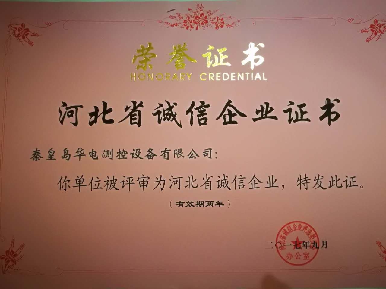 【企業(yè)要聞】秦皇島華電測(cè)控設(shè)備有限公司被評(píng)為“河北省誠(chéng)信企業(yè)”