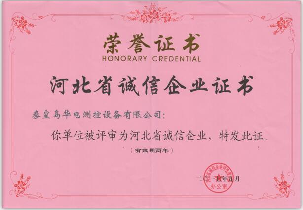 秦皇島華電測(cè)控設(shè)備有限公司被評(píng)為“河北省誠(chéng)信企業(yè)”;