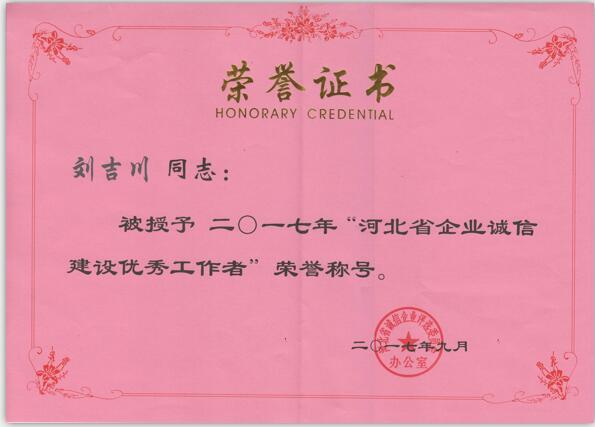 公司總經(jīng)理劉吉川先生被授予2017年“河北省企業(yè)誠(chéng)信建設(shè)優(yōu)秀工作者”榮譽(yù)稱(chēng)號(hào)!