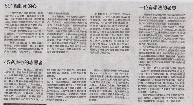 總經(jīng)理劉吉川先生的這一善行,受到了社會各界的廣泛關(guān)注,燕趙都市報、秦皇島晚報等各大媒體先后進行了采訪和報道。這也使得秦皇島市市民情感護理中心更廣泛的為人所知,從而能夠給廣大民眾提供更多的幫助,更好地服務(wù)于人民、服務(wù)于社會,最終為打造積極生態(tài)圈、構(gòu)建和諧社會、實現(xiàn)偉大的中國夢貢獻力量!