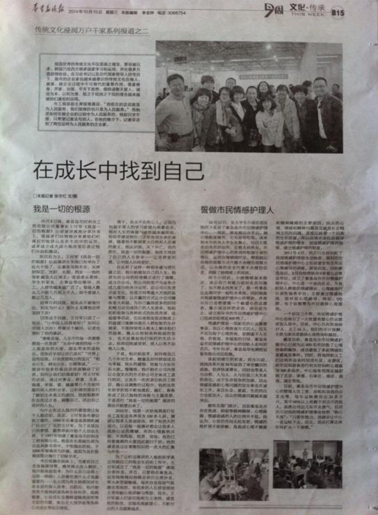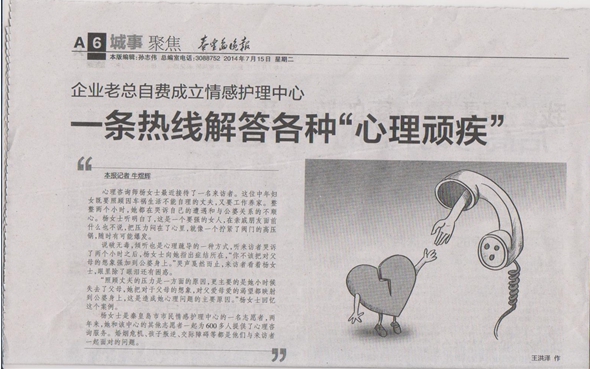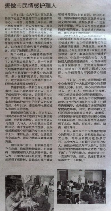 摘自《秦皇島晚報》(2014年10月15日,B15版):情感護理是一項新型的心靈慈善事業(yè),其以心理咨詢方式切入,但又不僅僅限于心理咨詢,更側(cè)重于人生觀、價值觀、幸福觀的引導(dǎo)。秦皇島市市民情感護理中心的創(chuàng)始人名叫劉吉川,今年51歲,秦皇島華電測控設(shè)備有限公司總經(jīng)理。