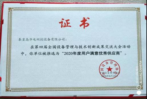 2020年8月22日,秦皇島華電測(cè)控設(shè)備有限公司應(yīng)中國(guó)設(shè)備管理協(xié)會(huì)邀請(qǐng),參加2020年第四屆全國(guó)設(shè)備管理與技術(shù)創(chuàng)新成果交流大會(huì)。并被推薦為“2020年度用戶滿意優(yōu)秀供應(yīng)商”。