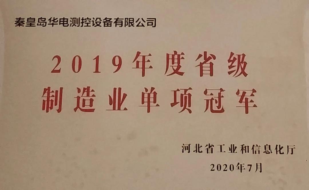 近日,秦皇島華電測(cè)控設(shè)備有限公司獲得了由河北省工業(yè)和信息化廳評(píng)選的“制造業(yè)單項(xiàng)冠軍”并頒發(fā)了榮譽(yù)證書。