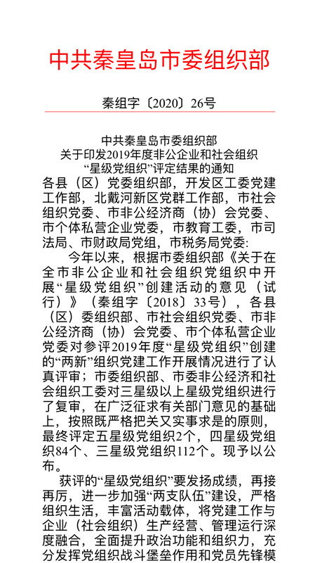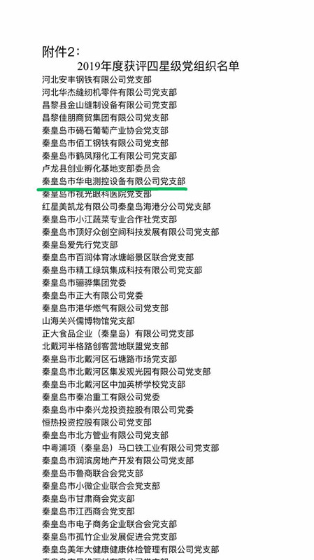 2020年,中共秦皇島華電測(cè)控設(shè)備有限公司支部委員會(huì)通過(guò)自下而上的方式申報(bào)至上級(jí)街道黨工委,上級(jí)黨工委指派專(zhuān)人到基層組織進(jìn)行測(cè)評(píng)、考評(píng),經(jīng)黨委會(huì)議評(píng)定并公示后確定評(píng)星等級(jí),授星,我公司支部委員會(huì)被評(píng)定為四星級(jí)黨組織。