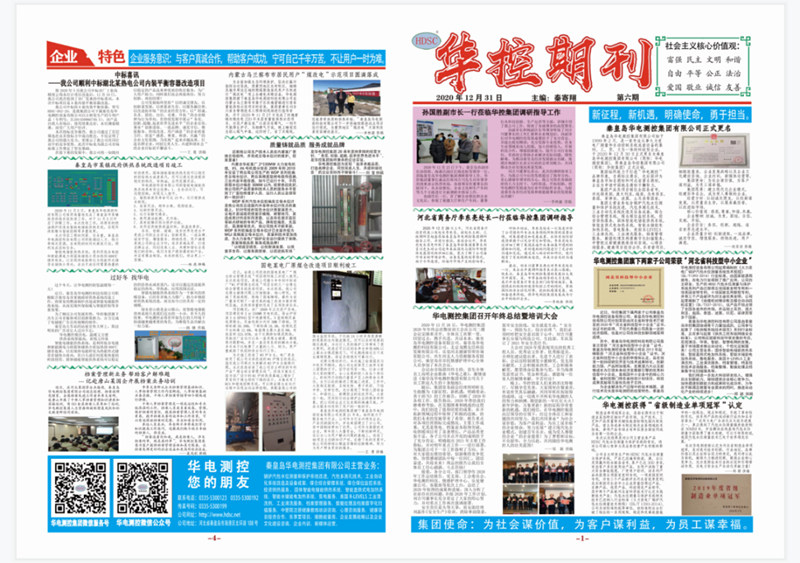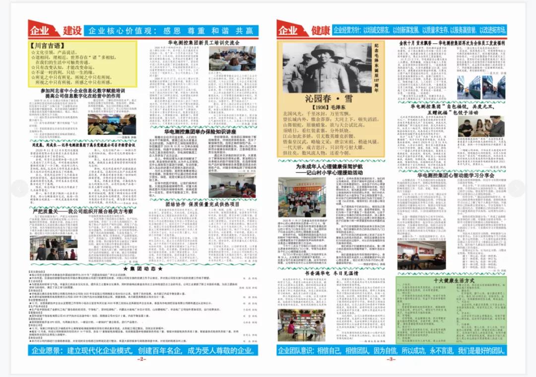 華電測控期刊自創(chuàng)建成立以來,以集團各子公司發(fā)展主營業(yè)務(wù)、黨建活動、情感護理、健康管理為內(nèi)容,旨在向大家宣傳公司的企業(yè)文化和致力于打造“華電測控”品牌形象,堅持為社會謀價值、為客戶謀利益、為員工謀幸福的集團使命;堅持建立現(xiàn)代化企業(yè)模式、創(chuàng)建百年名企、成為受人尊敬企業(yè)的集團愿景;堅持“以坦誠交朋友、以創(chuàng)新謀發(fā)展、以質(zhì)量求生存、以服務(wù)贏信譽、以改進拓市場”的企業(yè)經(jīng)營方針;以“坦誠、負責(zé)、團結(jié)、自信、克難、開拓”的企業(yè)精神為行為導(dǎo)向;在持續(xù)發(fā)展中展示“務(wù)實、創(chuàng)新、超越、追求世界先進水平”的企業(yè)宗旨;秉承“創(chuàng)新進取、一流品牌、誠實守信、增值服務(wù)、持續(xù)改進、用戶滿意”的企業(yè)質(zhì)量方針;營造“感恩、尊重、和諧、共贏”的企業(yè)文化氛圍。
