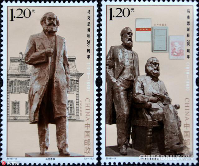 第二枚“馬克思與恩格斯像”,面值1.20元。主圖是馬克思與恩格斯一坐一立的雕像,背景畫面為《共產(chǎn)黨宣言》德文版、中文版以及《資本論》中文版等馬克思著作。這組馬克思與恩格斯雕像是根據(jù)吳為山先生創(chuàng)作的《偉大的友誼》雕塑設計的。馬克思和恩格斯之間的故事很多。恩格斯是馬克思最親密的戰(zhàn)友,他們?yōu)闊o產(chǎn)階級的革命事業(yè)共同戰(zhàn)斗40多年。2013年吳為山先生應中共中央宣傳部和中央編譯局之邀創(chuàng)作馬克思與恩格斯在一起的雕塑《偉大的友誼》。他設計的馬克思坐勢和恩格斯站姿形成一個穩(wěn)定的三角形,象征著他們堅定的信念和深厚而堅不可摧的友誼。從雕像的背后看,馬克思和恩格斯的背仿佛一座豐碑。馬克思深邃的目光流露出的睿智與光芒,帶有古典哲學家的風范;恩格斯剛毅佇立,一坐一立,充分體現(xiàn)了恩格斯對馬克思的尊重。雕塑《偉大的友誼》的藝術(shù)魅力,必定給游人留下想象的空間。