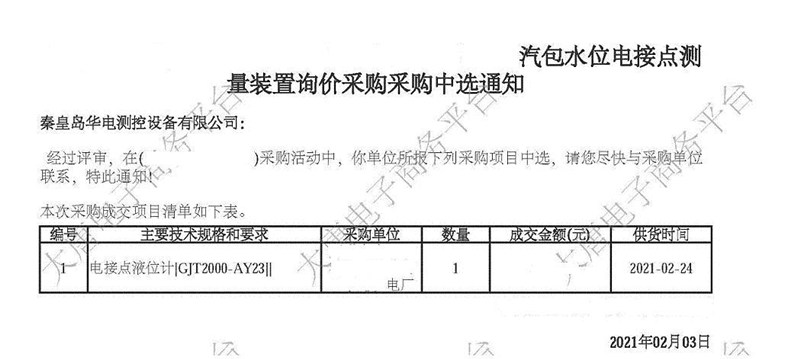 2021年2月3日,我公司在大唐集團安徽某電廠的電接點液位計改造項目的競標中,憑借強大的綜合實力以及過硬的產(chǎn)品質(zhì)量,通過層層篩選、激烈角逐,以絕對的優(yōu)勢順利中標。