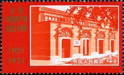 1971年7月1日發(fā)行的編12―20《慶祝中國(guó)共產(chǎn)黨成立50周年》紀(jì)念郵票,全套6枚。其中第1枚是“中共一大會(huì)址”,由許彥博設(shè)計(jì),影寫版,主圖為“一大會(huì)址”外景,畫面邊框采用紅底金字,表示建黨50周年的熱烈吉慶。在構(gòu)圖上突出了掛在自左第一、二扇門之間的石牌,牌上鐫刻著“中國(guó)共產(chǎn)黨第一次全國(guó)代表大會(huì)會(huì)址”、“全國(guó)重點(diǎn)文物保護(hù)單位”和“中華人民共和國(guó)國(guó)務(wù)院一九六一年三月四日公布”字樣。 《慶祝中國(guó)共產(chǎn)黨成立50周年》郵票首次“不走樣”地展現(xiàn)了中共一大會(huì)址的外景,整個(gè)票面紅彤彤的,象征著黨從這座石庫(kù)門中誕生,一路走來、走向輝煌的歷程。