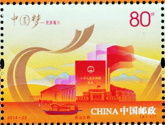 第四次:2014年9月20日,中國(guó)郵政發(fā)行2014-22《中國(guó)夢(mèng)―民族振興》郵票一套4枚,其中(4-1)“政治文明”圖案由包括南湖紅船在內(nèi)的建黨治國(guó)元素組成:郵票畫面從政治角度體現(xiàn)出黨和國(guó)家成立以來社會(huì)制度取得的巨大進(jìn)步。在這枚郵票上,既有上海一大會(huì)址,突出的嘉興南湖紅船又賦予了新的時(shí)代意義。