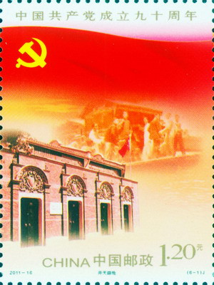 建黨90周年郵票:中國(guó)郵政于2011年6月22日發(fā)行《中國(guó)共產(chǎn)黨成立九十周年》紀(jì)念郵票1套6枚,小型張1枚。設(shè)計(jì)者:郝旭東。面值1.20元。