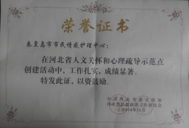 2014年11月,秦皇島市市民情感護(hù)理中心在河北省人文關(guān)懷和心理疏導(dǎo)示范點(diǎn)創(chuàng)建活動(dòng)中,工作扎實(shí),成績(jī)顯著,喜獲中共河北省委宣傳部、河北省思想政治工作研究會(huì)頒發(fā)的榮譽(yù)證書(shū)。