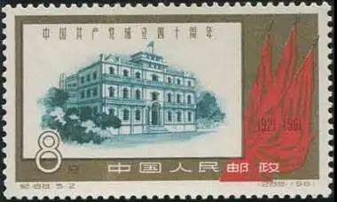 作為“南昌起義”總指揮部的“八一南昌起義大樓”是一座灰色磚混結(jié)構(gòu)建筑,它坐落在南昌中山路和勝利路交叉處的洗馬池,原名“江西大旅社”,現(xiàn)已改建為“八一南昌起義紀(jì)念館”。這座建筑曾多次登上郵票。其中發(fā)行于1961年7月1日的“紀(jì)88 5-2”,即《中國共產(chǎn)黨成立四十周年》郵票中的第二枚,面值8分,畫面圖案以金色作邊框,具有鮮明的時代特征。