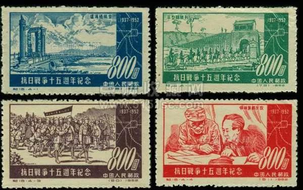第一枚,盧溝橋風云。1952年7月7日發(fā)行了首枚《抗日戰(zhàn)爭十五周年紀念》郵票,這是新中國第一枚反映抗戰(zhàn)的郵票。這枚膠版郵票長37毫米,寬21毫米,面值為人民幣舊幣800元。孫傳哲設計,主圖為盧溝橋全景,盧溝橋的上空風起云涌,象征著日寇全面侵華戰(zhàn)爭的來臨,橋身兩側(cè)護欄望柱的小石獅來整有序地并行排列,好像守衛(wèi)山河的忠誠戰(zhàn)士,橋身下靜靜流淌的永定河水,寓意著中國人民面對災難時的從容鎮(zhèn)定,遠處連綿起伏巍然屹立的太行群峰,宛如全民族筑起抗戰(zhàn)的鋼鐵長城。