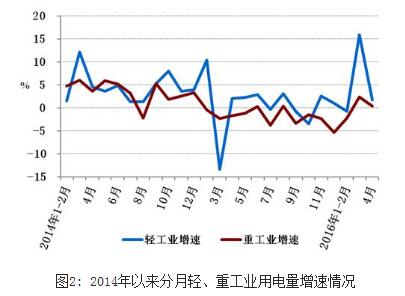 4月份,全國(guó)工業(yè)用電量3260億千瓦時(shí),同比增長(zhǎng)0.6%,占全社會(huì)用電量的比重為71.3%。其中,輕工業(yè)用電量581億千瓦時(shí),同比增長(zhǎng)1.7%,占全社會(huì)用電量的比重為12.7%;重工業(yè)用電量2679億千瓦時(shí),同比增長(zhǎng)0.3%,占全社會(huì)用電量的比重為58.6%。