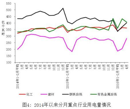 1-4月份,化學(xué)原料制品、非金屬礦物制品、黑色金屬冶煉、有色金屬冶煉四大高載能行業(yè)用電量合計(jì)5267億千瓦時(shí),同比下降 4.4%,增速比上年同期回落2.7個(gè)百分點(diǎn);合計(jì)用電量占全社會(huì)用電量的比重為29.1%,對(duì)全社會(huì)用電量增長(zhǎng)的貢獻(xiàn)率為-47.8%。其中,化工行業(yè)用電量1405億千瓦時(shí),同比增長(zhǎng)4.0%,增速比上年同期提高1.1個(gè)百分點(diǎn);建材行業(yè)用電量858億千瓦時(shí),同比下降2.2%,增速比上年同期提高4.3個(gè)百分點(diǎn);黑色金屬冶煉行業(yè)用電量1443億千瓦時(shí),同比下降11.6%;增速比上年同期回落4.7個(gè)百分點(diǎn);有色金屬冶煉行業(yè)1562億千瓦時(shí),同比下降5.4%,增速比上年同期回落9.1個(gè)百分點(diǎn)。