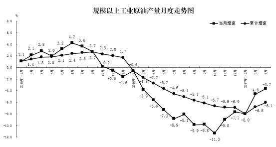原油生產(chǎn)降幅收窄,進(jìn)口增長(zhǎng)較快。4月份,原油產(chǎn)量1599.0萬噸,同比下降3.7%,降幅比3月份收窄0.9個(gè)百分點(diǎn)。1-4月份,原油產(chǎn)量6400.9萬噸,同比下降6.1%。進(jìn)口13912萬噸,同比增長(zhǎng)12.5%。