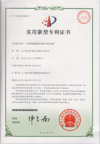 公司于2014年12月03日提交的“一種球型攝像機的智能自清洗裝置”專利已被中華人民共和國國家知識產權局頒發(fā)專利證書。