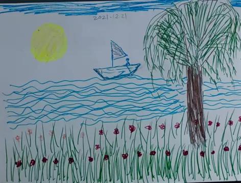 另一幅畫(huà)的作者,說(shuō)自己畫(huà)這畫(huà)時(shí),心里感覺(jué)可幸福了。坐在小船里的人就是自己,正在大海中徜徉。海岸上有很多的花兒開(kāi)放著,還有一顆大樹(shù)。當(dāng)然還有自己的愛(ài)人和孩子,藍(lán)藍(lán)的天空,一個(gè)大大的太陽(yáng)。