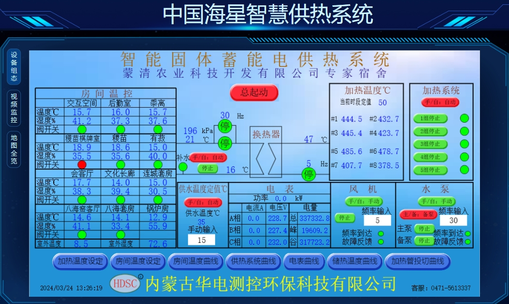 內蒙古蒙清農(nóng)業(yè)科技開發(fā)有限公司原有智能固體蓄能電供熱系統(tǒng)和智能水蓄能電供熱系統(tǒng)都是通過西門子Wincc進行控制和監(jiān)控,并通過向日葵遠程控制軟件實現(xiàn)遠程控制,與公司的中國海星智慧供熱系統(tǒng)完全不匹配,無論是公司的統(tǒng)一管理和操作感受都較為不便,所以公司決定對蒙清用戶做系統(tǒng)升級改造,歷時三天終于將內蒙古蒙清使用的智能固體蓄能電供熱系統(tǒng)、智能水蓄能電供熱系統(tǒng)成功并入中國海星智慧供熱系統(tǒng)。