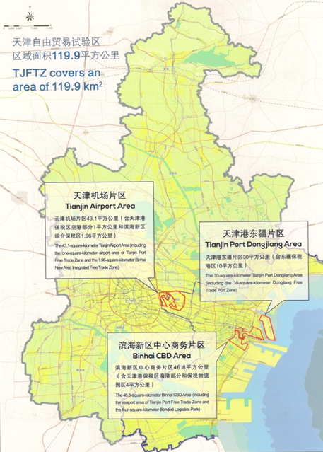 天津自貿(mào)區(qū)2014年12月31日獲國務(wù)院正式批復(fù),2015年4月21日正式掛牌,總面積119.9平方公里,是我國北方第一個(gè)自貿(mào)試驗(yàn)區(qū),也是繼上海成立自貿(mào)區(qū)以來,與福建、廣東同時(shí)獲批的第二批自由貿(mào)易試驗(yàn)區(qū)之一。其產(chǎn)業(yè)定位涵蓋了面積30平方公里,以發(fā)展航運(yùn)物流、國際貿(mào)易、融資租賃等現(xiàn)代服務(wù)業(yè)為主的天津港東疆片區(qū);面積43.1平方公里,以發(fā)展高端制造業(yè)和與之配套的生產(chǎn)性服務(wù)業(yè)為主的天津機(jī)場片區(qū);面積46.8平方公里,以發(fā)展金融創(chuàng)新為主的現(xiàn)代服務(wù)業(yè)濱海新區(qū)中心商務(wù)片區(qū)三個(gè)片區(qū)。