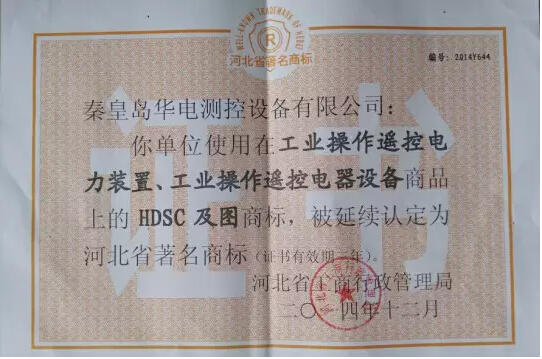 近日,公司收到河北省工商行政管理局頒發(fā)的“河北省著名商標(biāo)”證書(shū)。這是公司使用在工業(yè)操作遙控電力裝置、工業(yè)操作遙控電器設(shè)備商品上的HDSC及圖商標(biāo),繼2008年首次被認(rèn)定為“河北省著名商標(biāo)”后的連續(xù)認(rèn)定,證書(shū)編號(hào)為:2014Y644。