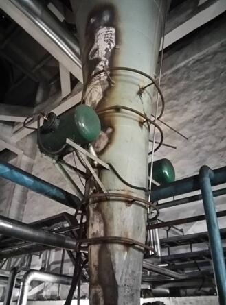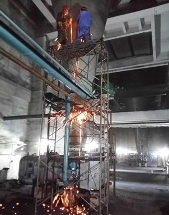 為了不影響正常的運行,該廠采用了空氣炮、氣旋管、人工疏松等辦法進行處理,但是收效甚微,直至今日空氣炮儼然成為了雞肋,為了保證安全運行鍋爐運行人員必須每班安排專人進行維護,大量消耗了人力與物力。為解決煤倉堵煤、棚煤問題,該廠決定在十臺煤倉上安裝我公司煤倉疏松機,下圖為現(xiàn)場施工人員安裝我公司煤倉疏松裝置。