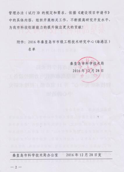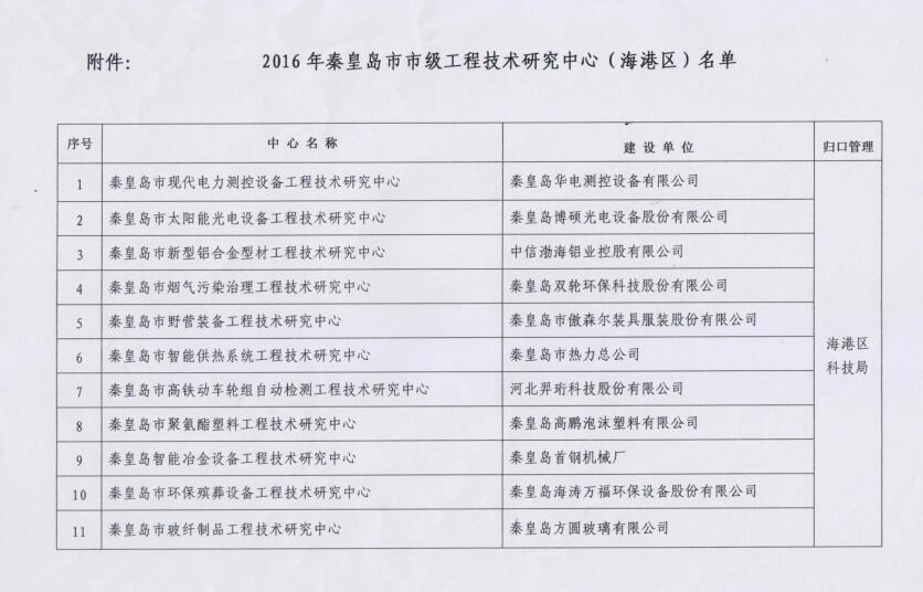 2016年公司申請(qǐng)建設(shè)的“秦皇島現(xiàn)代電力測(cè)控設(shè)備工程技術(shù)研究中心”市級(jí)工程技術(shù)研究中心,經(jīng)過秦皇島市科學(xué)技術(shù)局組織進(jìn)行的形式審查、現(xiàn)場(chǎng)考察和專家論證等環(huán)節(jié),認(rèn)為中心研究方向合理,建設(shè)目標(biāo)明確,內(nèi)容具體、有操作性,被認(rèn)定為秦皇島市市級(jí)工程技術(shù)研究中心。