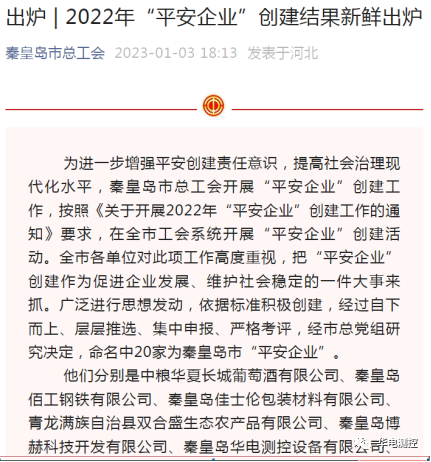 2022年,為進(jìn)一步增強(qiáng)企業(yè)安全生產(chǎn)主體責(zé)任和全員安全責(zé)任意識(shí),有效提升企業(yè)安全管理水平,秦皇島華電測(cè)控設(shè)備有限公司響應(yīng)秦皇島總工會(huì)開展的“平安企業(yè)”創(chuàng)建工作,按照《關(guān)于開展2022年“平安企業(yè)”創(chuàng)建工作的通知》要求,打造高標(biāo)準(zhǔn)“平安企業(yè)”。經(jīng)過嚴(yán)格考評(píng),秦皇島華電測(cè)控設(shè)備有限公司被秦皇島市總工會(huì)命名為2022年秦皇島市“平安企業(yè)”。More